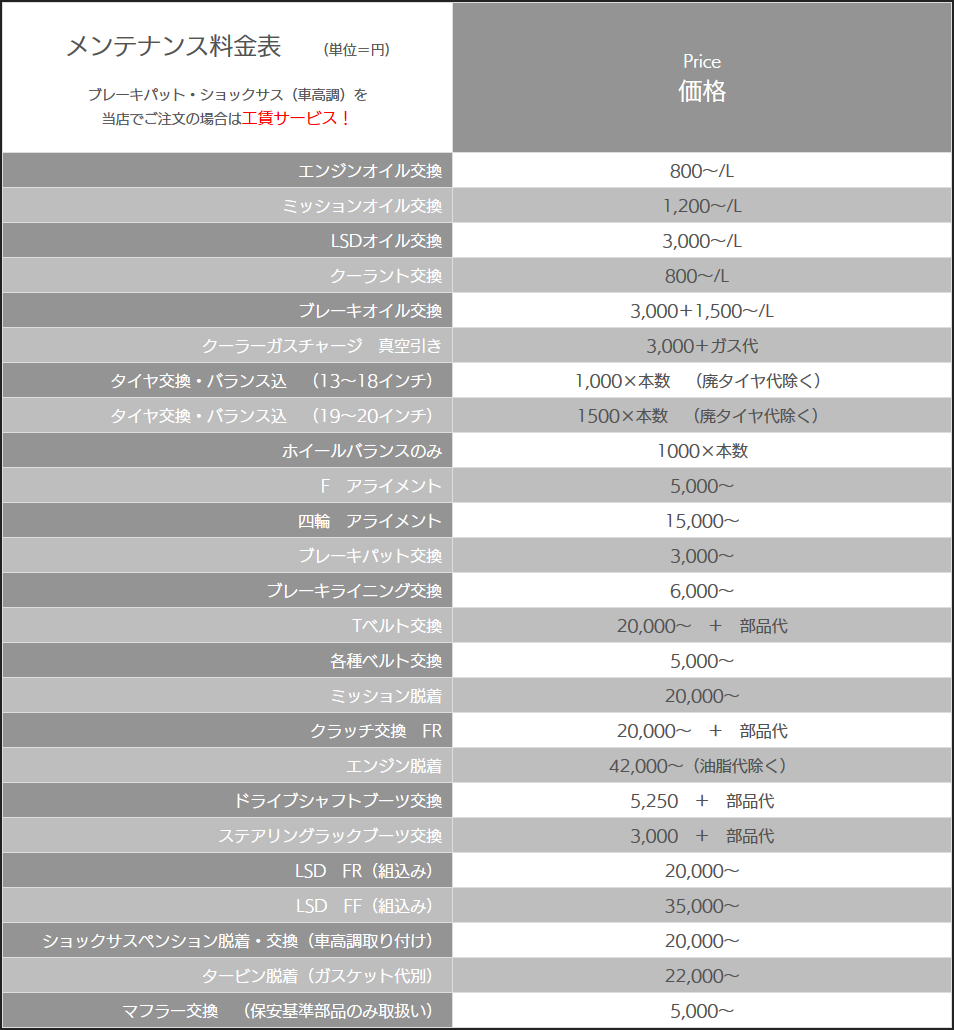 メンテナンス料金表 (単位=円) ブレーキパット・ショックサス(車高調)を 当店でご注文の場合は工賃サービス! |