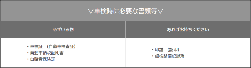 ・車検証 (自動車検査証) ・自動車納税証明書 ・自賠責保険証 |