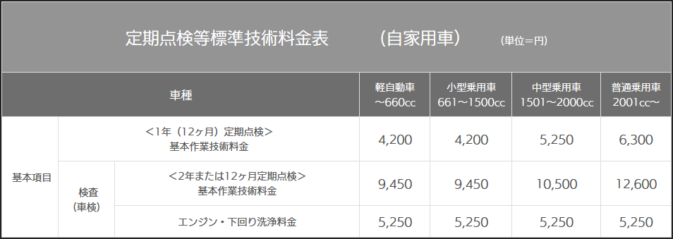 基本項目 | <1年(12ヶ月)定期点検> 基本作業技術料金 |