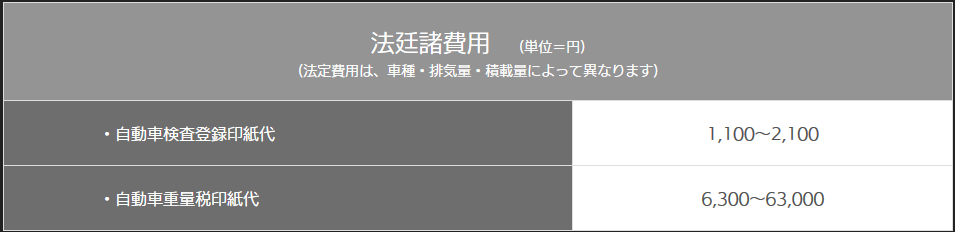 法廷諸費用 (単位=円) (法定費用は、車種・排気量・積載量によって異なります) |