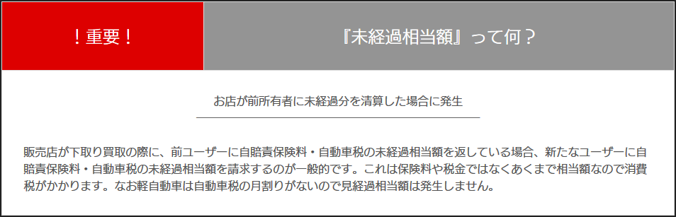 ――――――――――――――――――――――――― 販売店が下取り買取の際に、前ユーザーに自賠責保険料・自動車税の未経過相当額を返している場合、新たなユーザーに自賠責保険料・自動車税の未経過相当額を請求するのが一般的です。これは保険料や税金ではなくあくまで相当額なので消費税がかかります。なお軽自動車は自動車税の月割りがないので見経過相当額は発生しません。 |