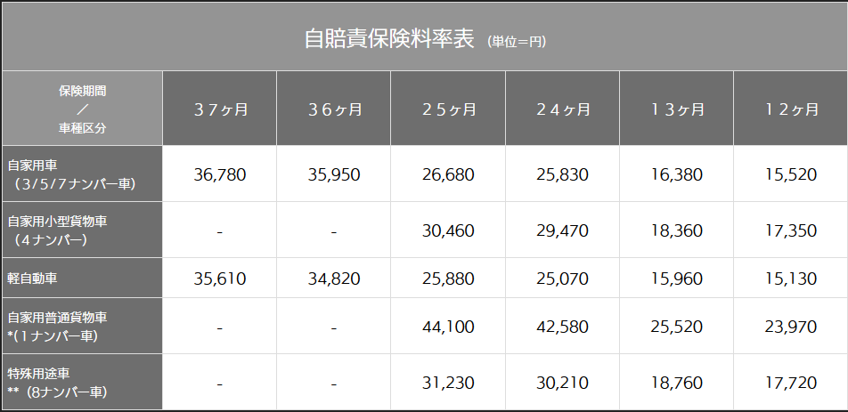 「強制保険」と呼ばれる自賠責保険ですが、次回の車検日をカバーしているため、車検の際に必要な自賠責保険料は24ヶ月分ではなく1ヶ月をプラスした25ヶ月分になります。 |