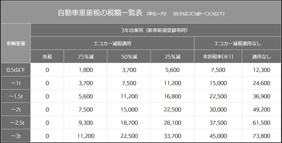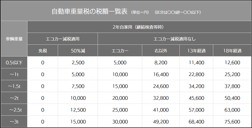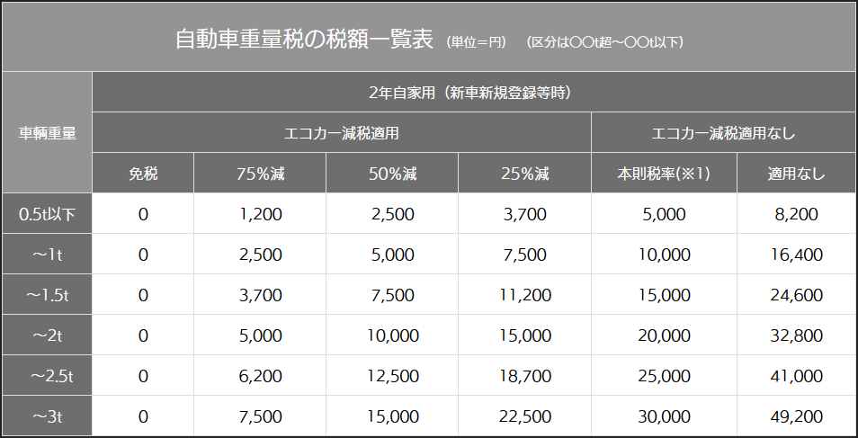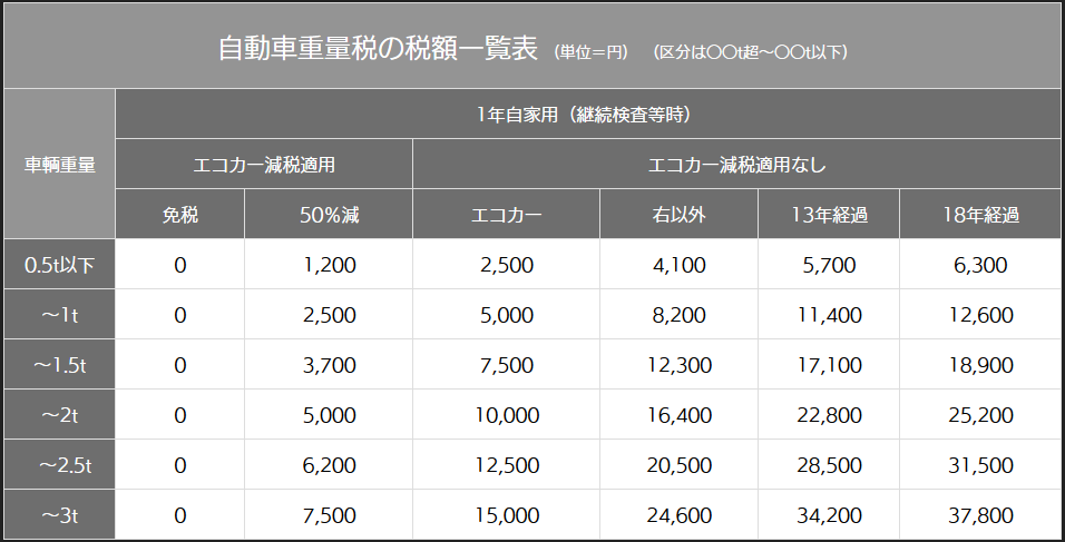 - 上記税額は自家用乗用車のもので、商用車の税率とは異なります。