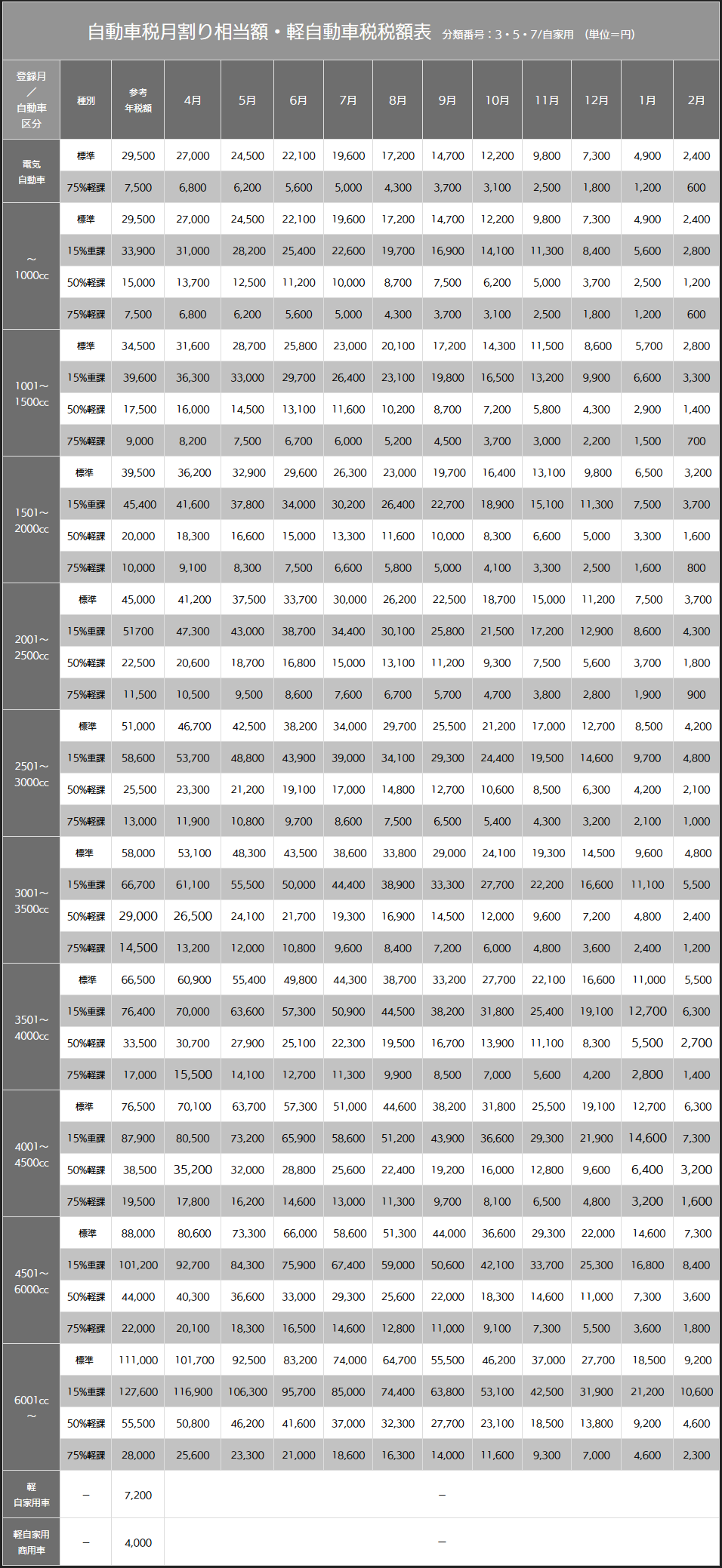 自動車税月割り相当額・軽自動車税税額表 分類番号:3・5・7/自家用 (単位=円) |